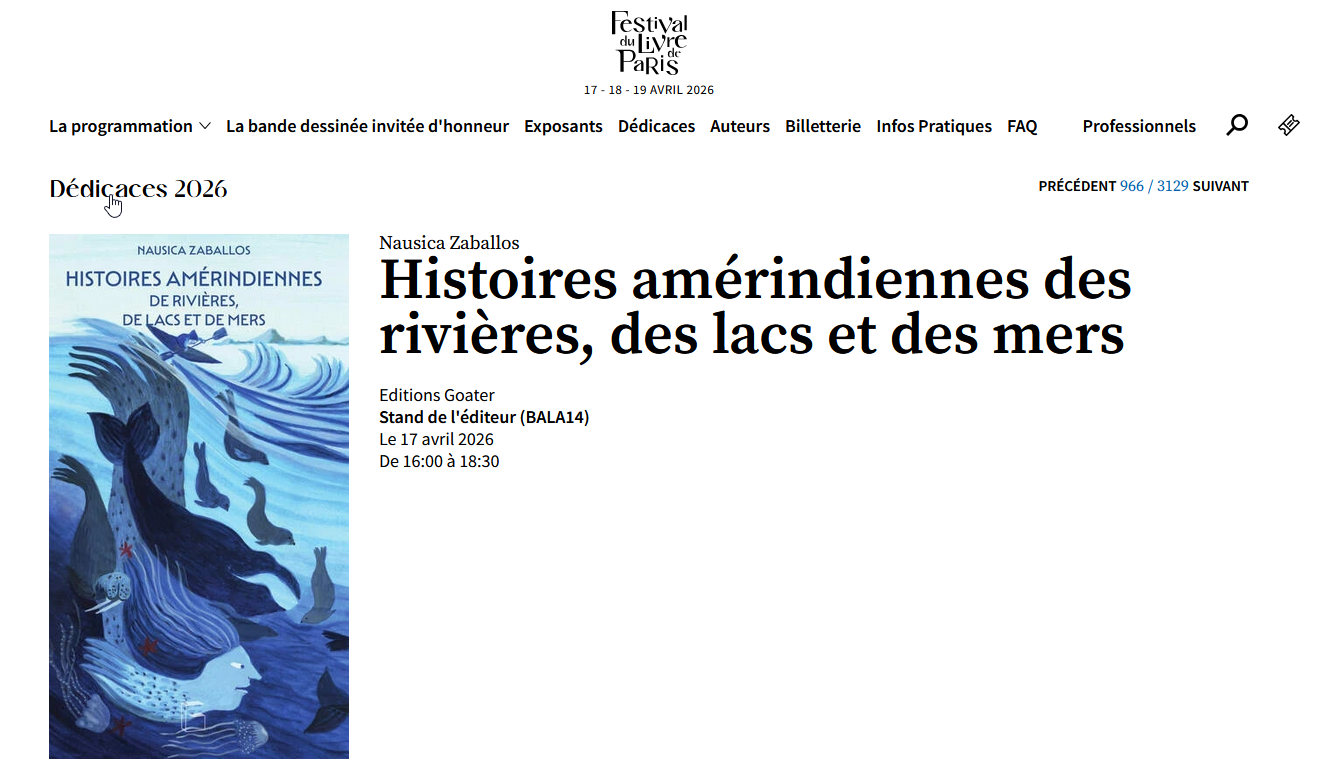 RDV au salon du livre : Vendredi 17 avril de 16h à 18h30 Posted on12 avril 202612 avril 2026 Auteur span>Nausica ZaballosLaisser un commentaire Je serais présente au Salon du Livre de Paris vendredi 17 avril de 16h à 18h30 pour Histoires amérindiennes des rivières, des lacs et des mers Au GRAND PALAIS avec les éditions Goater Stand de l’éditeur (BALA14)